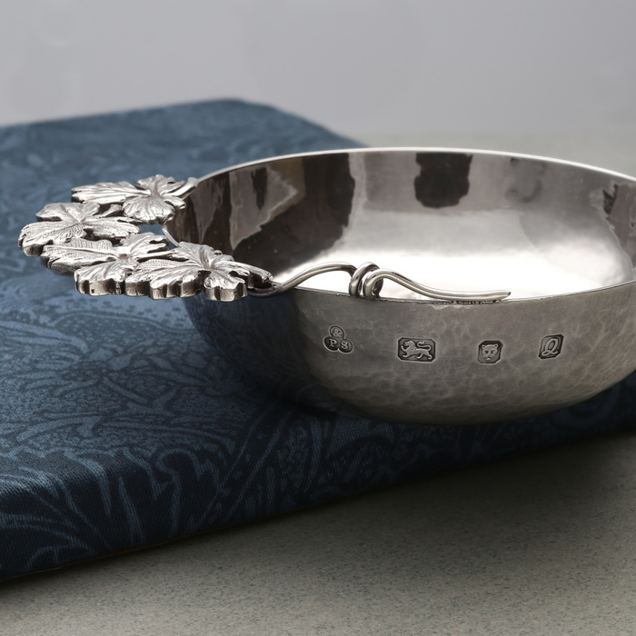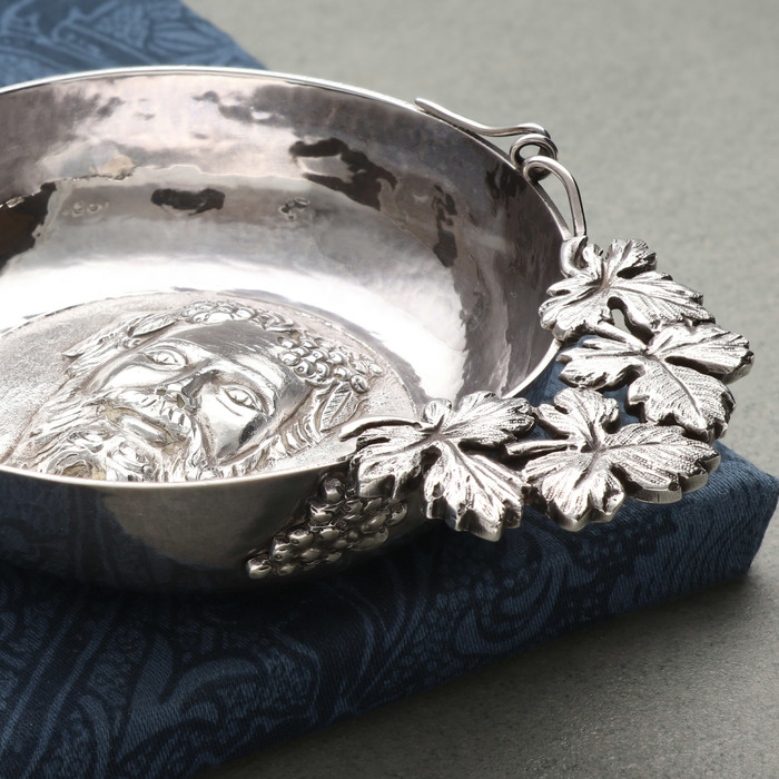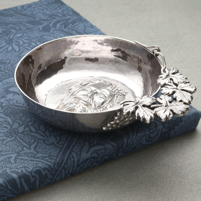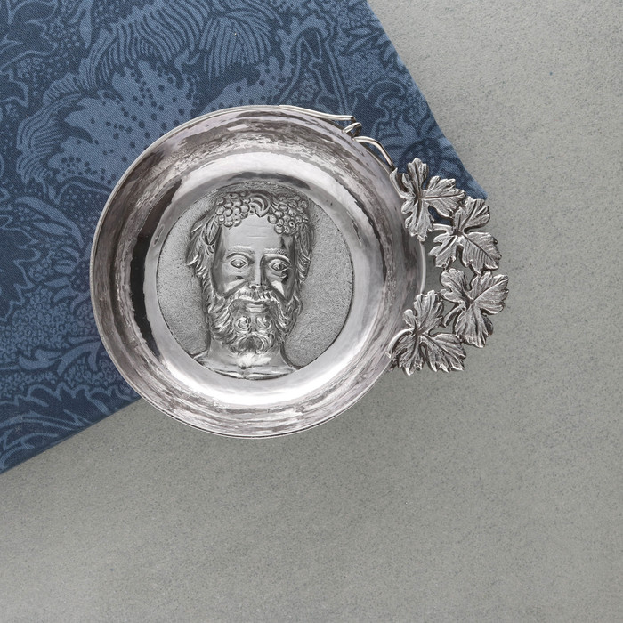 Sterling silver wine taster, with Bacchus and vine leaf handle. By Payne & Son Ltd, London 1990.