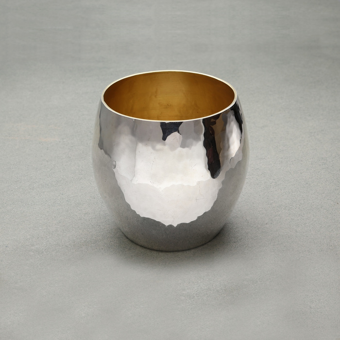 Sterling silver hammered beaker, barrel shaped with gilded interior.