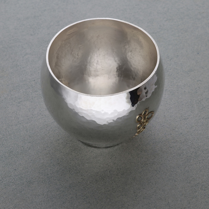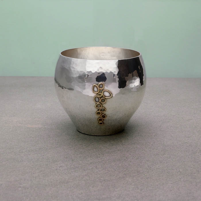 Sterling silver hammered beaker of tapering form. With a group of gold wire circles running latitudinally on one side.