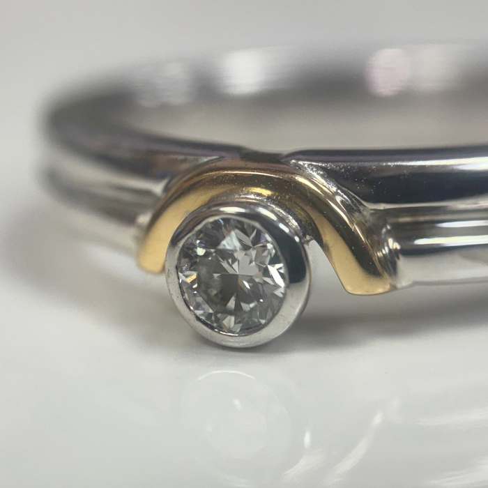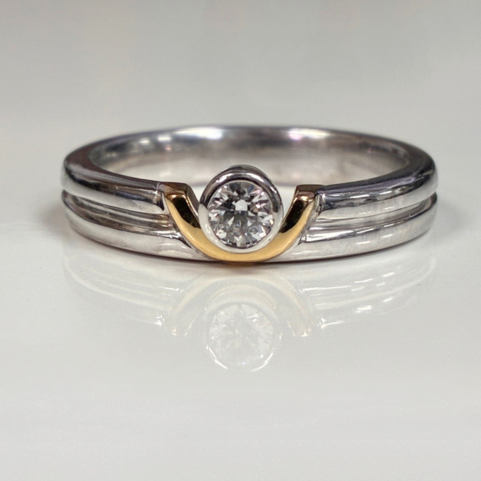 A round brilliant cut diamond (estimated weight: 0.20cts, assessed: G VS), rubover set in a white collet. A crescent of yellow metal arcing around the diamond, upon a white band with central line detail.