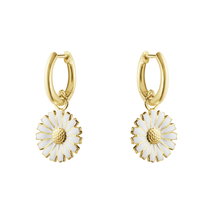 Georg Jensen; Daisy hoop earrings 2025, in gold plated sterling silver and white enamel petals.