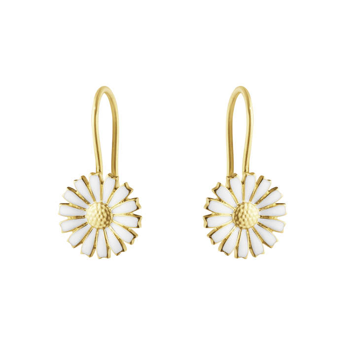 Georg Jensen; Daisy earhooks #2025, in gold plated sterling silver & white enamel. Diameter 11mm.