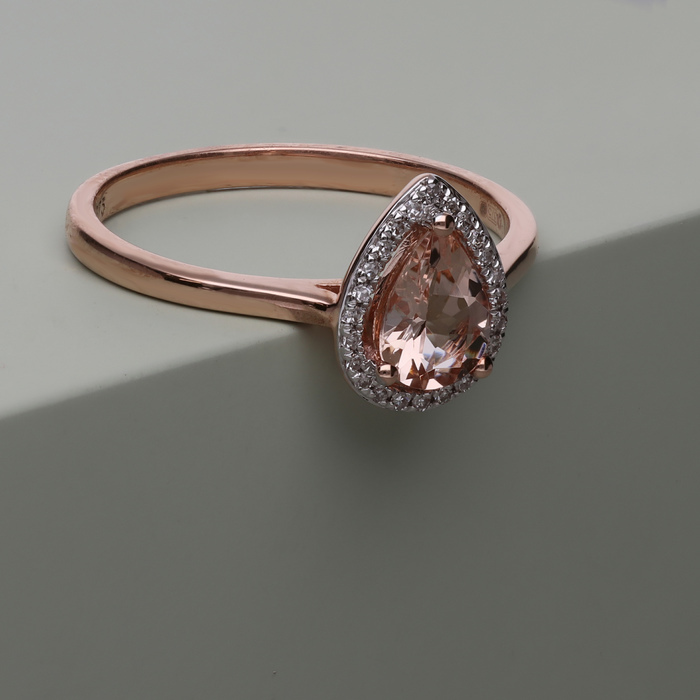Pear cut morganite, 0.56ct, 3 claw set within a cluster of diamonds, 0.07cts, micro claw set in 9ct white gold with rose gold under settings and band.