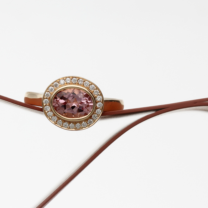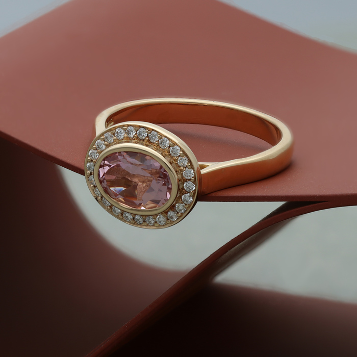 Oval facted 1.11ct morganite rubover set 'landscape' within a cluster of 24x round brilliant cut diamonds, 0.16cts GVS, grain & thread edge set.