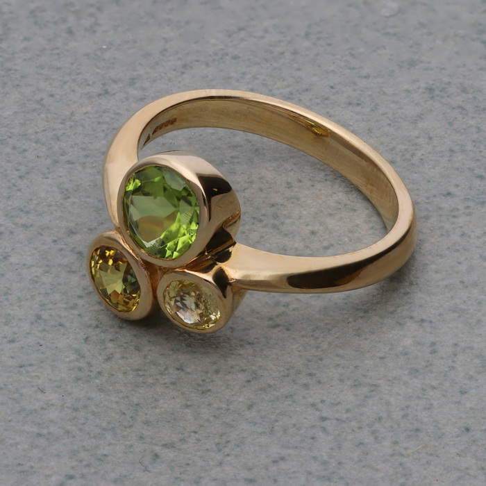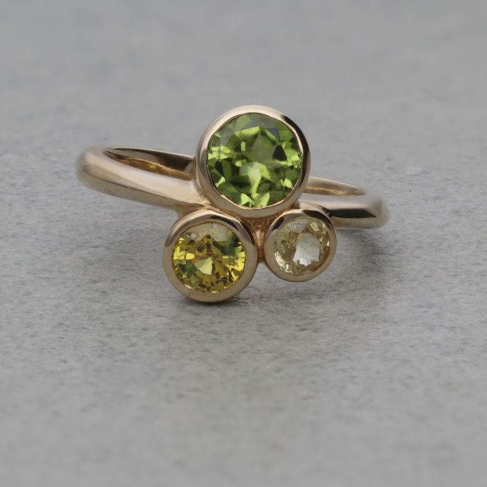 6mm diameter round faceted peridot, 5mm round 'parti' sapphire (yellow w. green) & a 4mm round pale yellow sapphire. All rubover set in an all 9ct yellow gold mount.