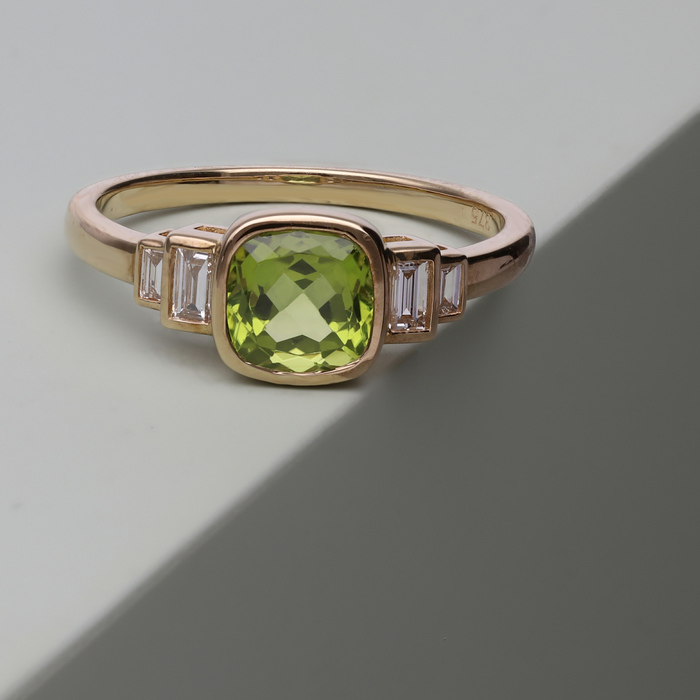 Cushion facted 1.27ct peridot with graduated pairs of baguette cut diamonds each side, all rubover set in a yellow gold mount.