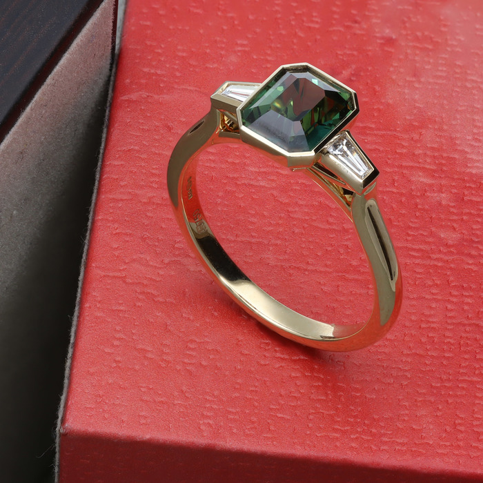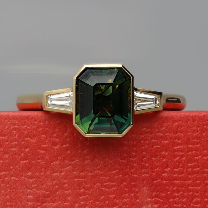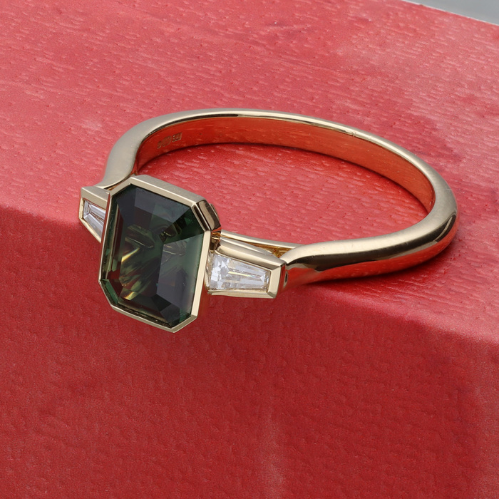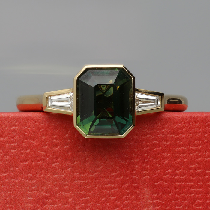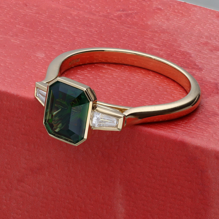 A certificated natural (no heat treatment) green/blue 2.02ct sapphire from Sri Lanka. Two tapered baguette cut diamonds, 0.28cts. Rubover settings, wed-fit head, all 18ct yellow gold mount.