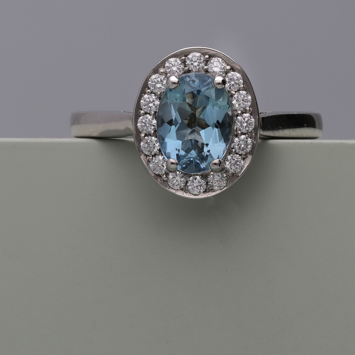 Oval faceted aquamarine, 1.10ct, 4 claw set within a cluster of 16 round brilliant cut diamonds, 0.23cts FGVS, grain set to an all platinum wed-fit mount.