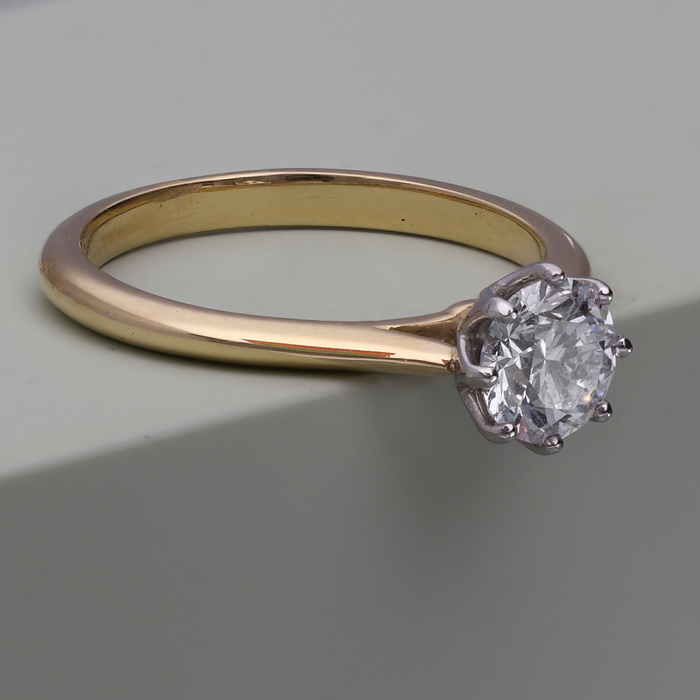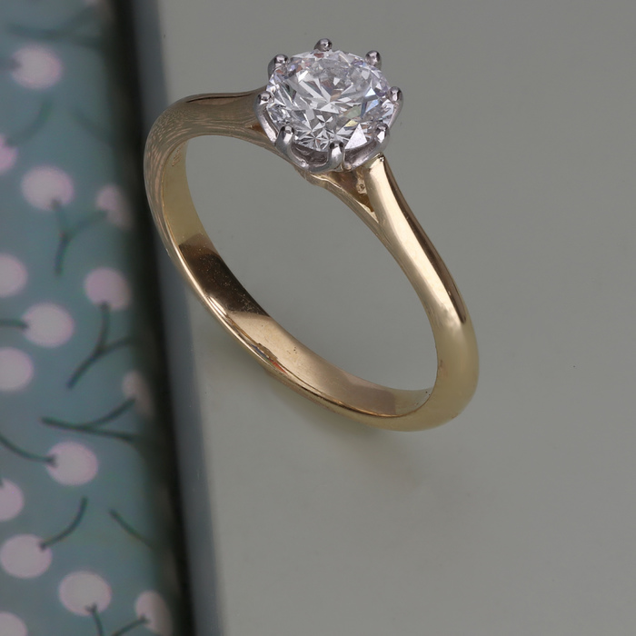 Ring; Single stone diamond, eight claw set within a platinum lattice collet and 18ct yellow gold wed-fit mount.