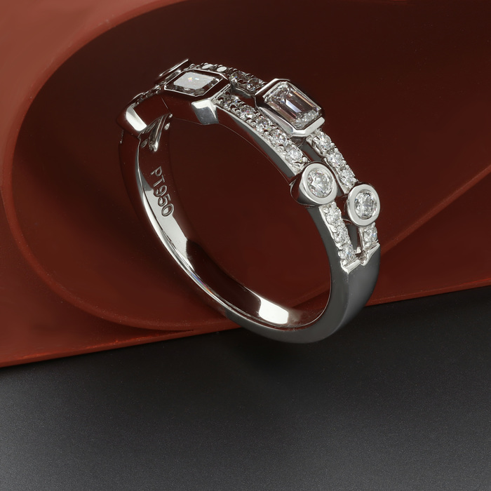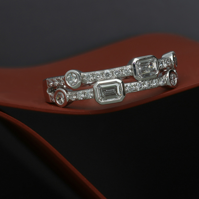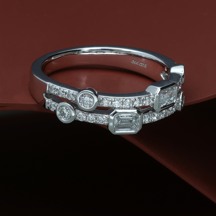 Two emerald cut diamonds and four larger round brilliant cut diamonds in rubover settings, spaced by pavé set diamonds across two rows, 50% of the way round an all platinum mount.