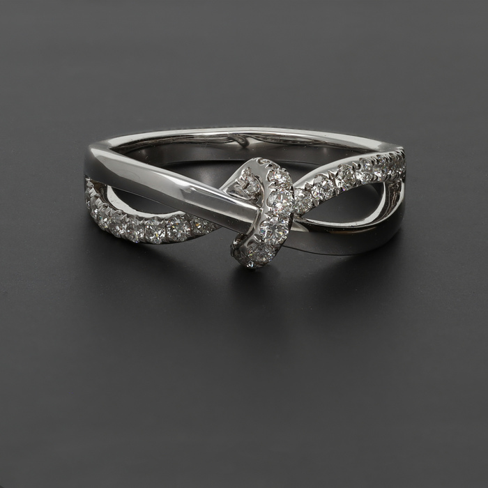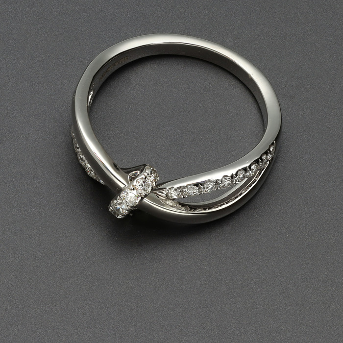 Ring; 18ct white gold curved band with diamond set looping ribbon.