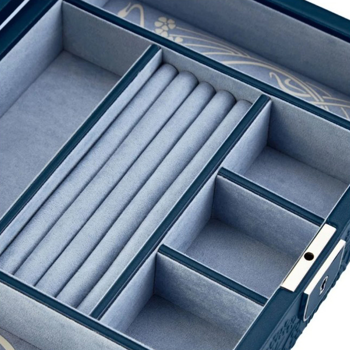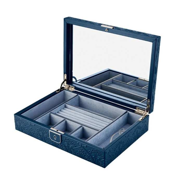 WOLF X LIBERTY Medium Jewellery Box, featuring Liberty’s iconic Ianthe design in an all-over embossed design. Crafted in a sustainable bio-based material in navy with silver finish hardware, it offers 4 ring rolls, 6 storage sections, supplied with key and a full mirror.