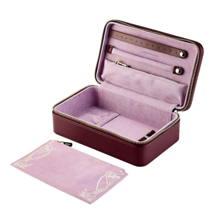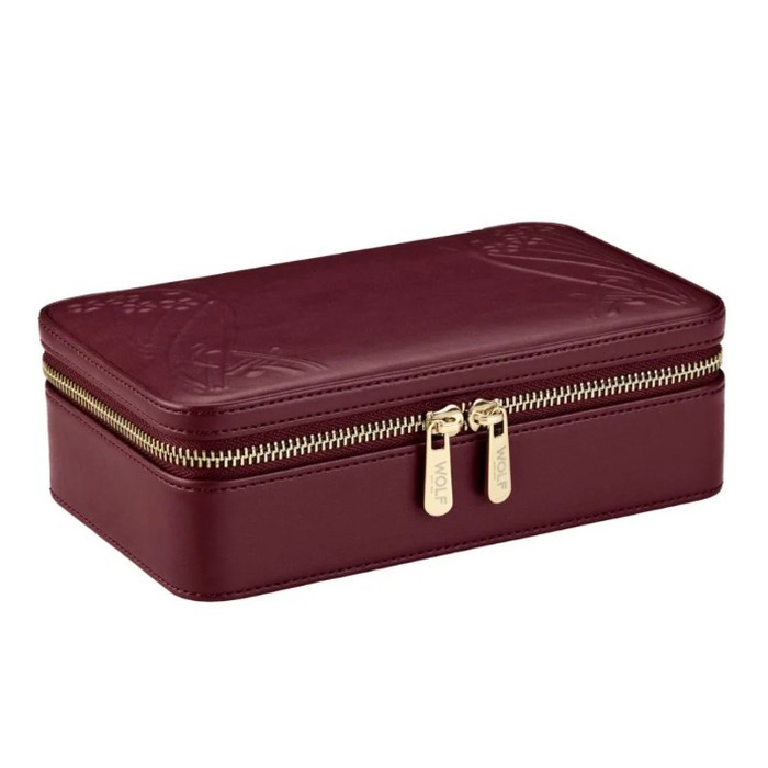 WOLF X LIBERTY Medium Jewellery Zip Case, handmade in a burgundy sustainable bio-based material with embossed Liberty Ianthe design exterior. With space for rings, earrings, necklaces, and a removable zip pouch.