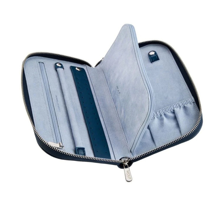 WOLF X LIBERTY Travel Jewellery Portfolio elevates your jewellery organisation. Handmade in a navy bio-based material featuring Liberty’s iconic Ianthe design embossed on its exterior; the WOLF X LIBERTY Travel Jewellery Portfolio is both beautiful and sustainable. With tabs for earrings and rings, snap-on necklace holders, zip pockets, and a centre pouch, it’s the perfect balance of style and classic heritage design.