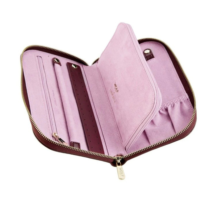 WOLF X LIBERTY Travel Jewellery Portfolio elevates your jewellery organisation. Handmade in a burgundy bio-based material featuring Liberty’s iconic Ianthe design embossed on its exterior; the WOLF X LIBERTY Travel Jewellery Portfolio is both beautiful and sustainable. With tabs for earrings and rings, snap-on necklace holders, zip pockets, and a centre pouch, it’s the perfect balance of style and classic heritage design.