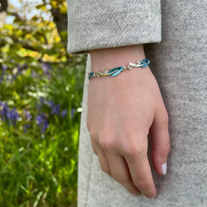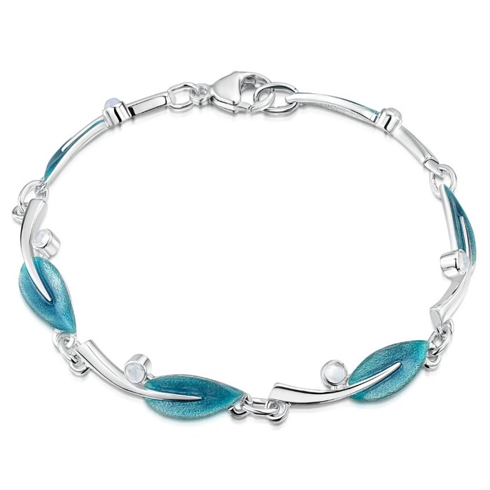 Silver Rowan bracelet, with rubover set Moonstones in the Sage enamel colour scheme.