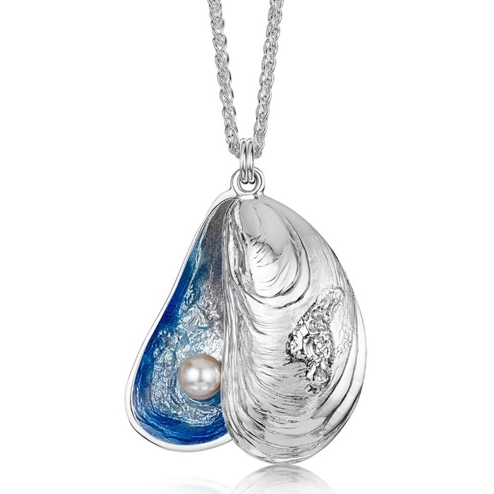 Silver mussel double pendant with 6mm freshwater cultured pearl with blue enamel background.