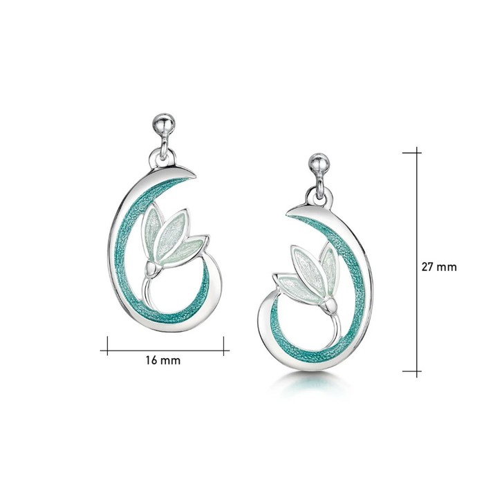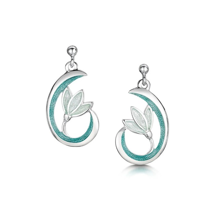 Silver and enamel drop earrings, Snowdrop with Leaf enamel