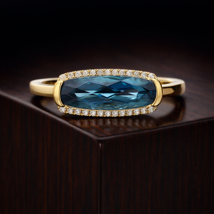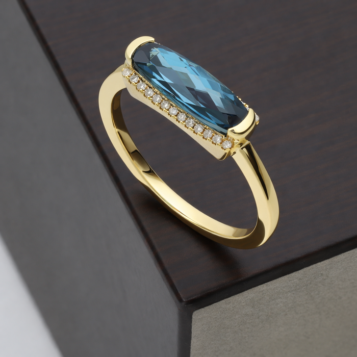An elongated cushion shaped chequerboard 1.62ct Blue Topaz set across the finger with capped end claws. Flanked by 2 rows of brilliant cut diamonds (26 in total at 0.08cts combined weight), all 9ct yellow gold mount.