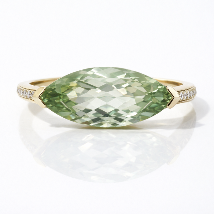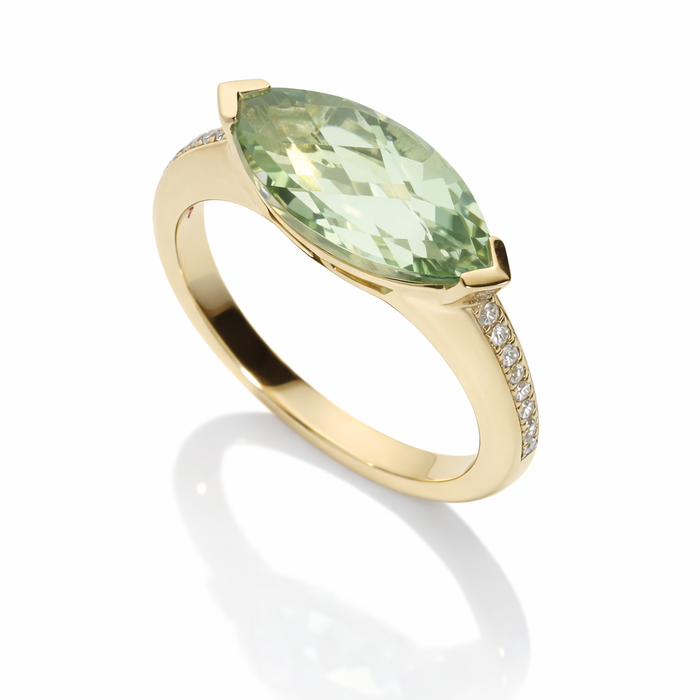 Marquise chequerboard cut 2.85ct green quartz, 2 capped claw set 'landscape' / across the finger. Panelled shoulders, with the 2 ridges grain set with sets of 9 graduated brilliant cut diamonds (0.07cts).