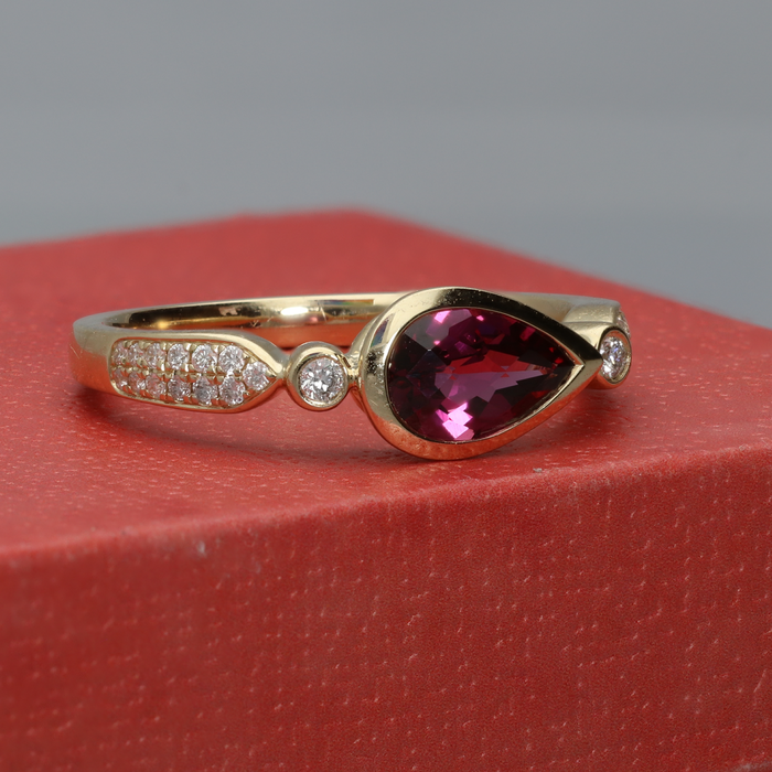Pear chequerboard 1.16ct garnet rubover set across the finger with 2 round brilliant cut diamonds rubover set to each end. Pavé set diamond shoulders to an all 9ct yellow gold mount.