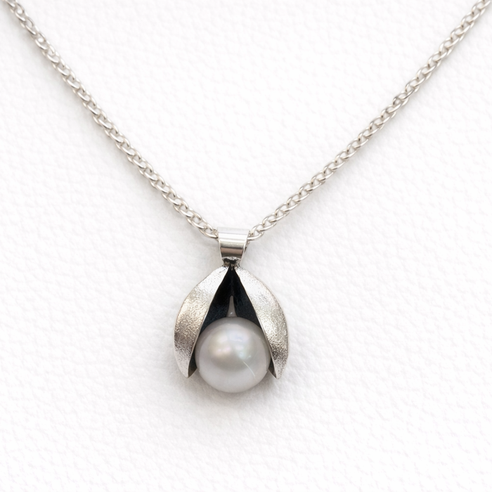 Silver Clam Shell pendant, with a grey coloured Freshwater Cultured Pearl. Set on a silver Spiga chain, length 16".