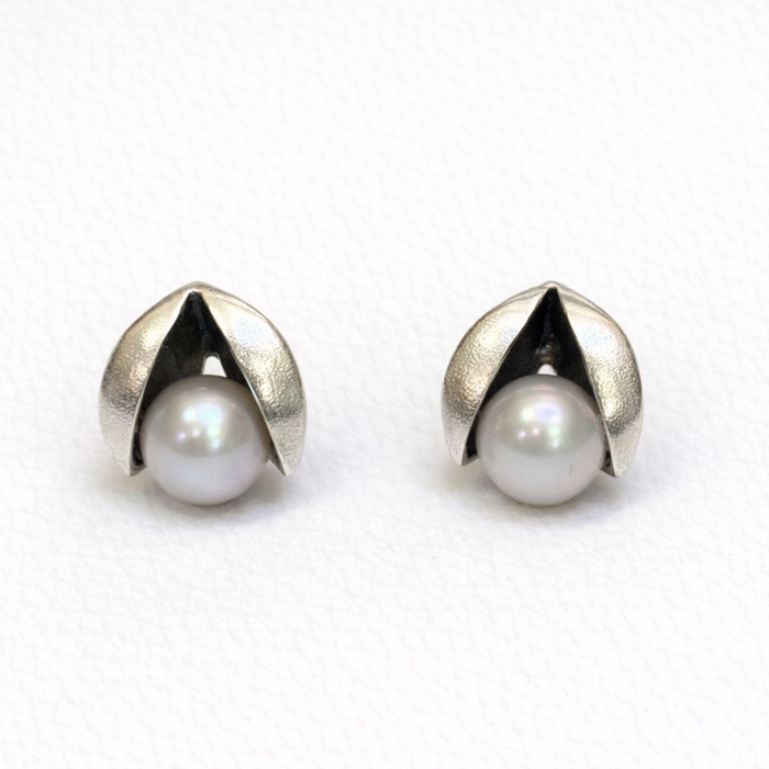 Silver and oxidised Clam Shell stud earrings, with a grey coloured Freshwater Cultured Pearl.