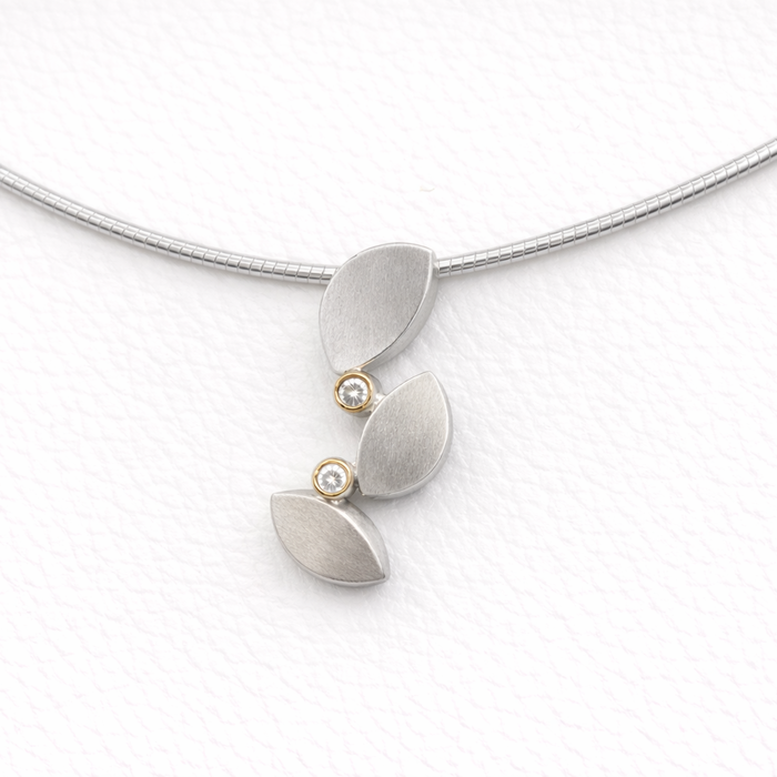Silver triple leaf necklet, with two rubover set round brilliant cut Diamonds in 18ct yellow gold rubover settings. On a silver Omega wire, length 16".