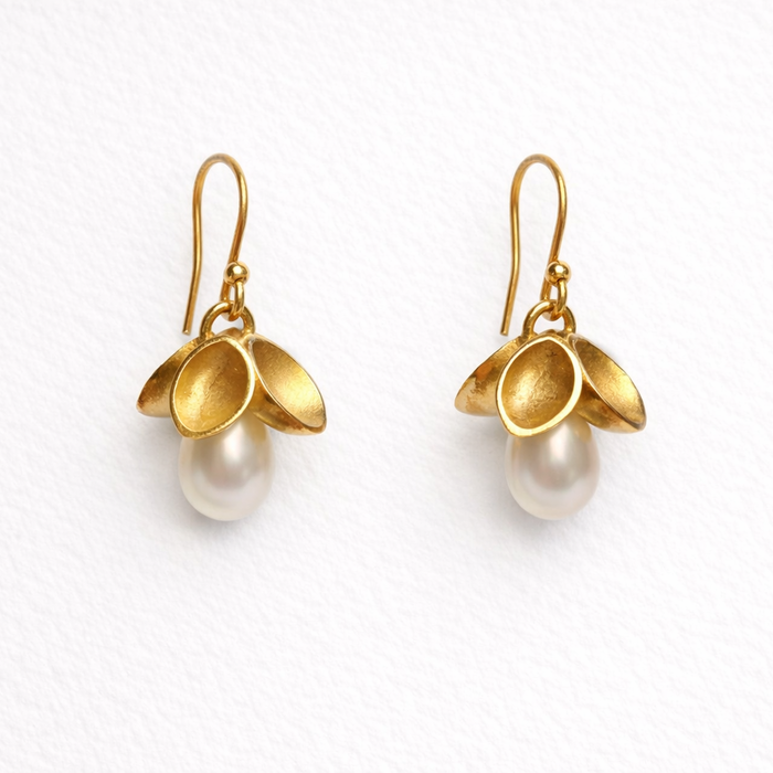 Silver gilt Oyster drop earrings, set with oval freshwater Cultured pearls, on hook fittings.