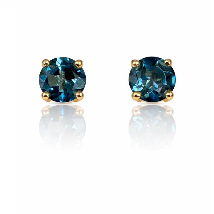 Earrings; London Blue Topaz Studs, four claw set in 9ct yellow gold. London Blue Topaz 2.04cts