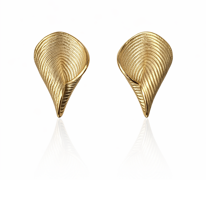 9ct yellow gold textured folding leaf stud earrings, 20mm x 13mm.