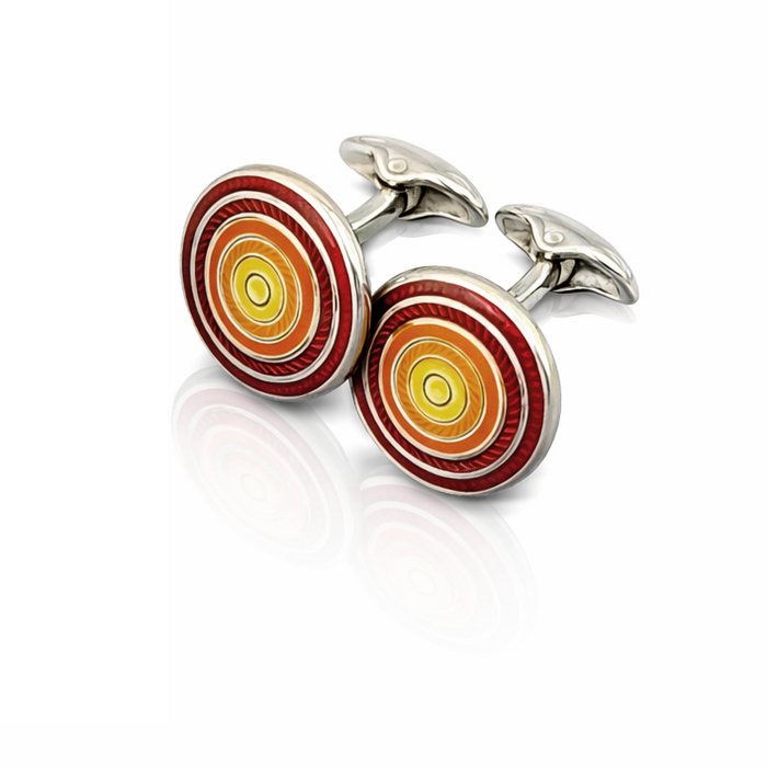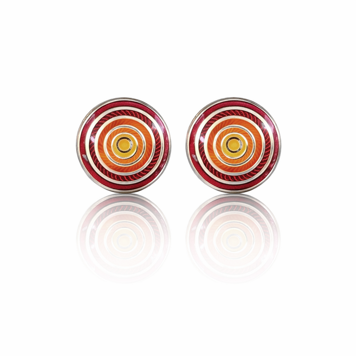 Silver round cufflnks with gradated red, orange and yellow enamel swirls, on swivel bar fittings.