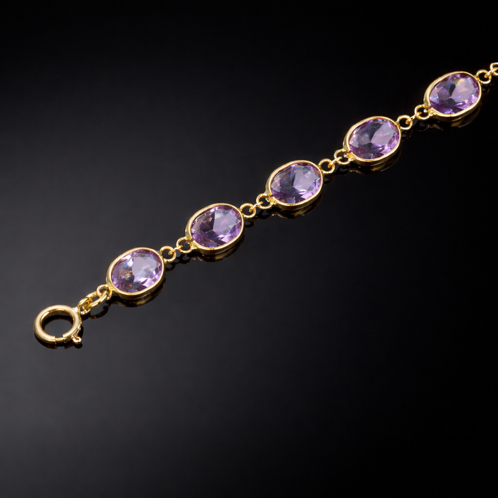 Bracelet; Amethyst, oval faceted amethysts rubover set in 18ct yellow gold spectacle mounts.