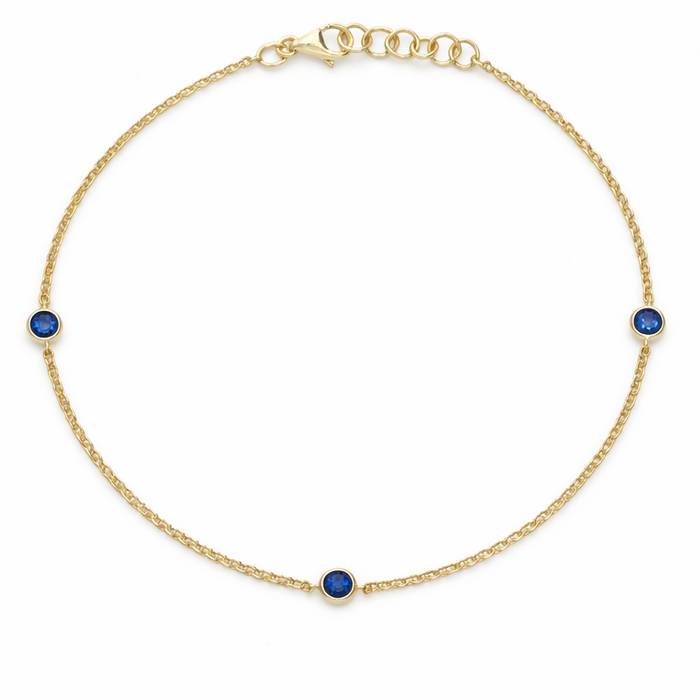 Bracelet; 18ct yellow gold trace link,with three rubover set sapphires. Sapphire weight 0.30cts.