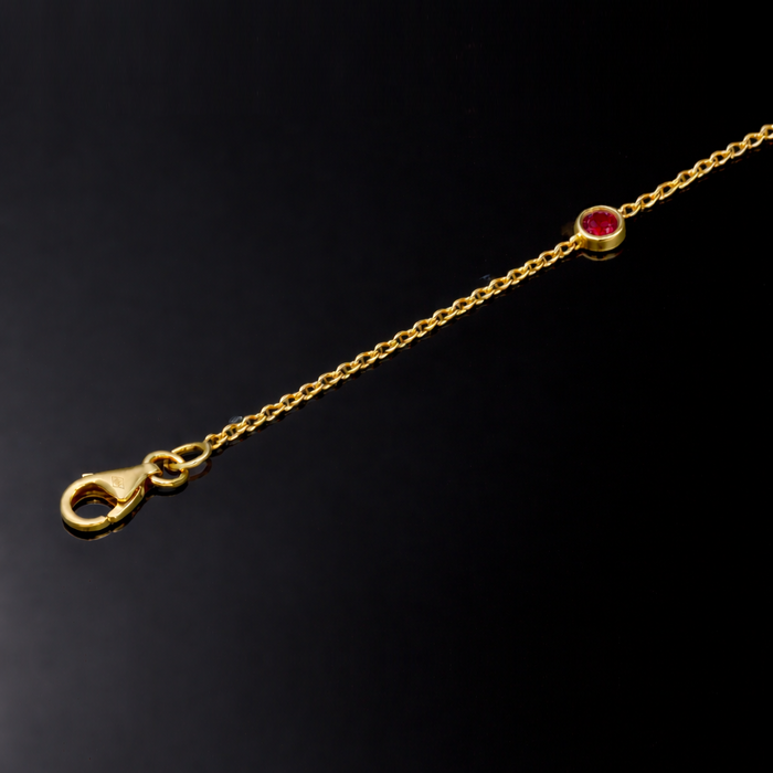 Bracelet; 18ct yellow gold trace link,with three rubover set rubies. Ruby weight 0.35cts.