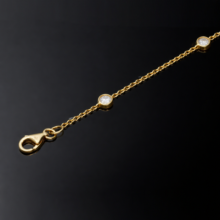 Bracelet; 18ct yellow gold trace set with five rubover set round brilliant cut diamonds.