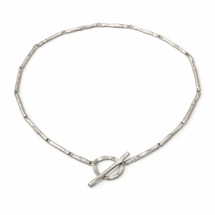 Textured bar links of varying sizes & T-bar style feature clasp. Designed by Liesbeth Busman.