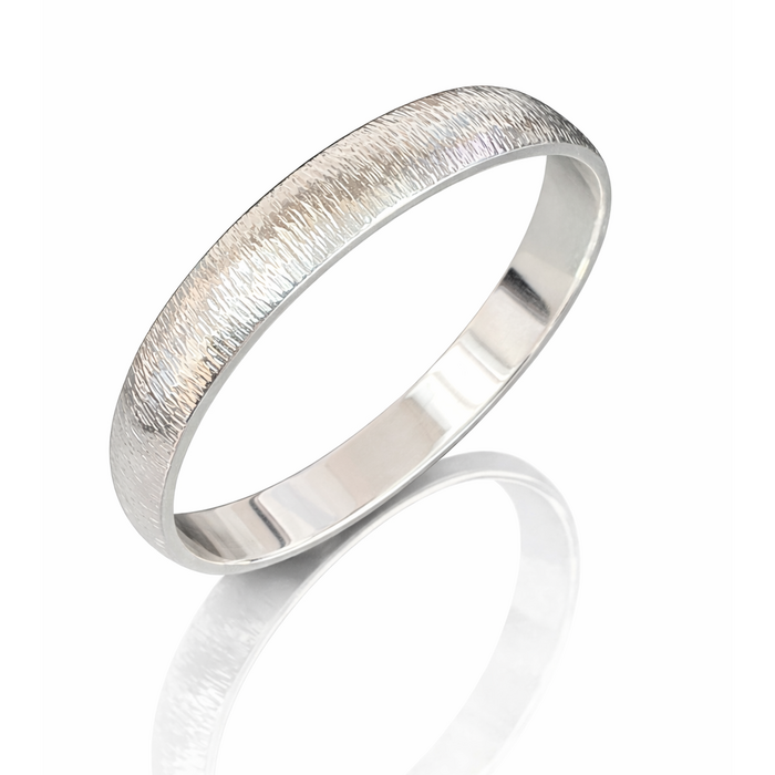 Sterling silver D-section bangle with bark texture. Internal diameter 69mm.
