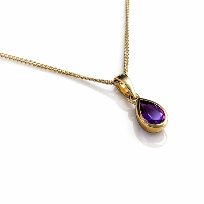 Pendant; Amethyst single stone, rubover set in 9ct yellow gold. Pear shaped amethyst 0.35cts.