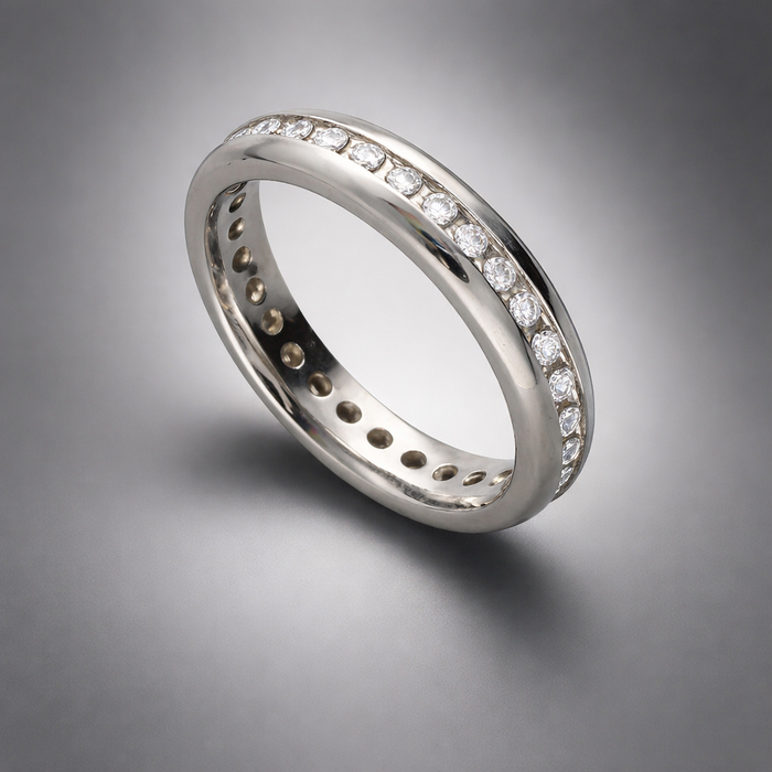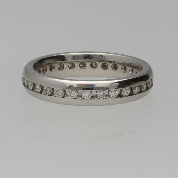 Twenty-nine round brilliant cut Diamonds, 0.52cts in total, channel set into 4mm wide heavy courted platinum band.