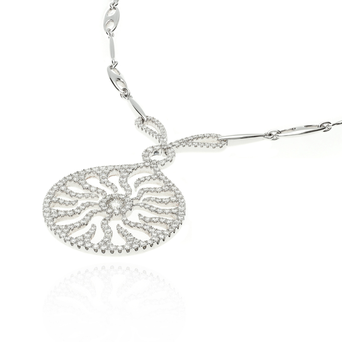 Round brilliant cut Diamonds micro set within an enclosed flaming circle and twin loop bow shaped top, 2.50cts in total, suspended on a 43cm (17") plain marine link chain all in 18ct white gold.