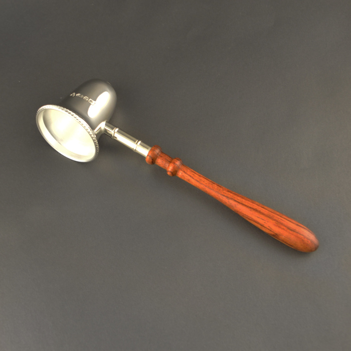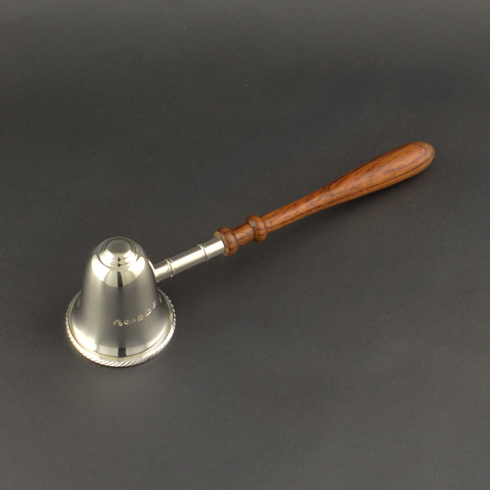 A polished sterling silver candle snuffer, with a spun wooden handle, length 5½" in length.