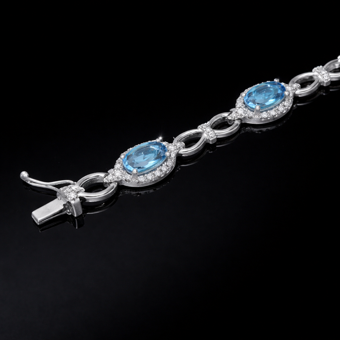 Seven oval faceted Aquamarines, 5.36cts in total, set within clusters of round brilliant cut Diamonds with Diamond accented figure of eight connectors, 0.81cts in total, all in 18ct white gold with a box link clasp with figure of 8 safety catch.