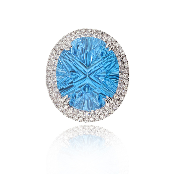 Fantasy cut oval blue Topaz, 20.46cts, twin claw set within a micro claw set double row of brilliant cut Diamonds, 0.60cts in total, colour G, clarity VS, all within an 18ct white gold bespoke mount.
